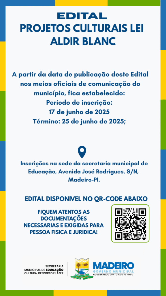 Com a abertura do Edital de Projetos Culturais, a Prefeitura Municipal de Madeiro e a Secretaria Municipal de Educação reafirmam seu compromisso com a valorização dos artistas locais, criando um espaço de crescimento, reconhecimento e incentivo à produção cultural no município.