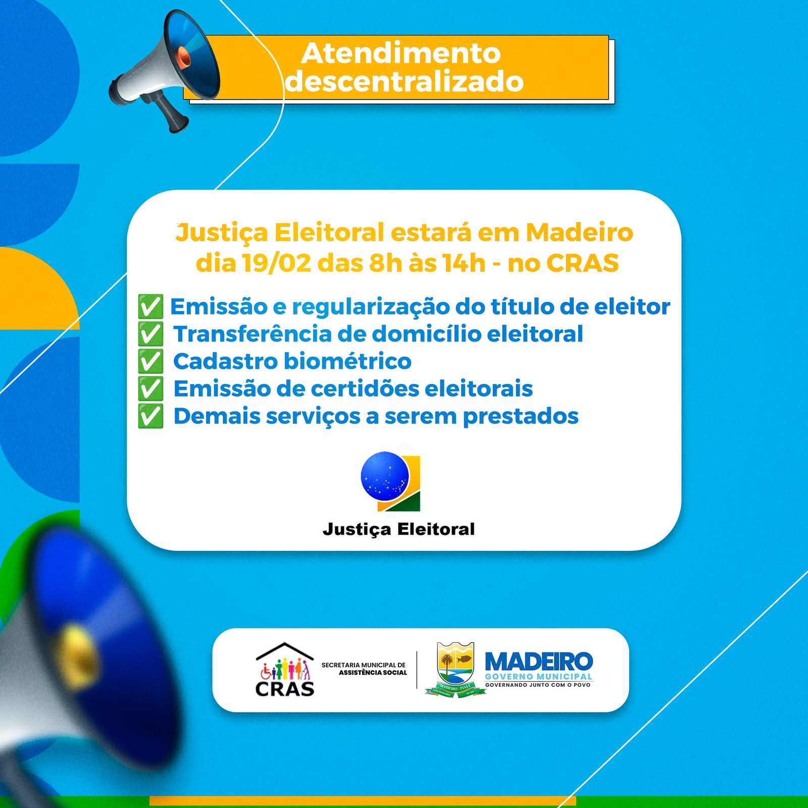 A Justiça Eleitoral estará no CRAS de Madeiro no dia 19/02, das 8h às 14h, oferecendo serviços como: