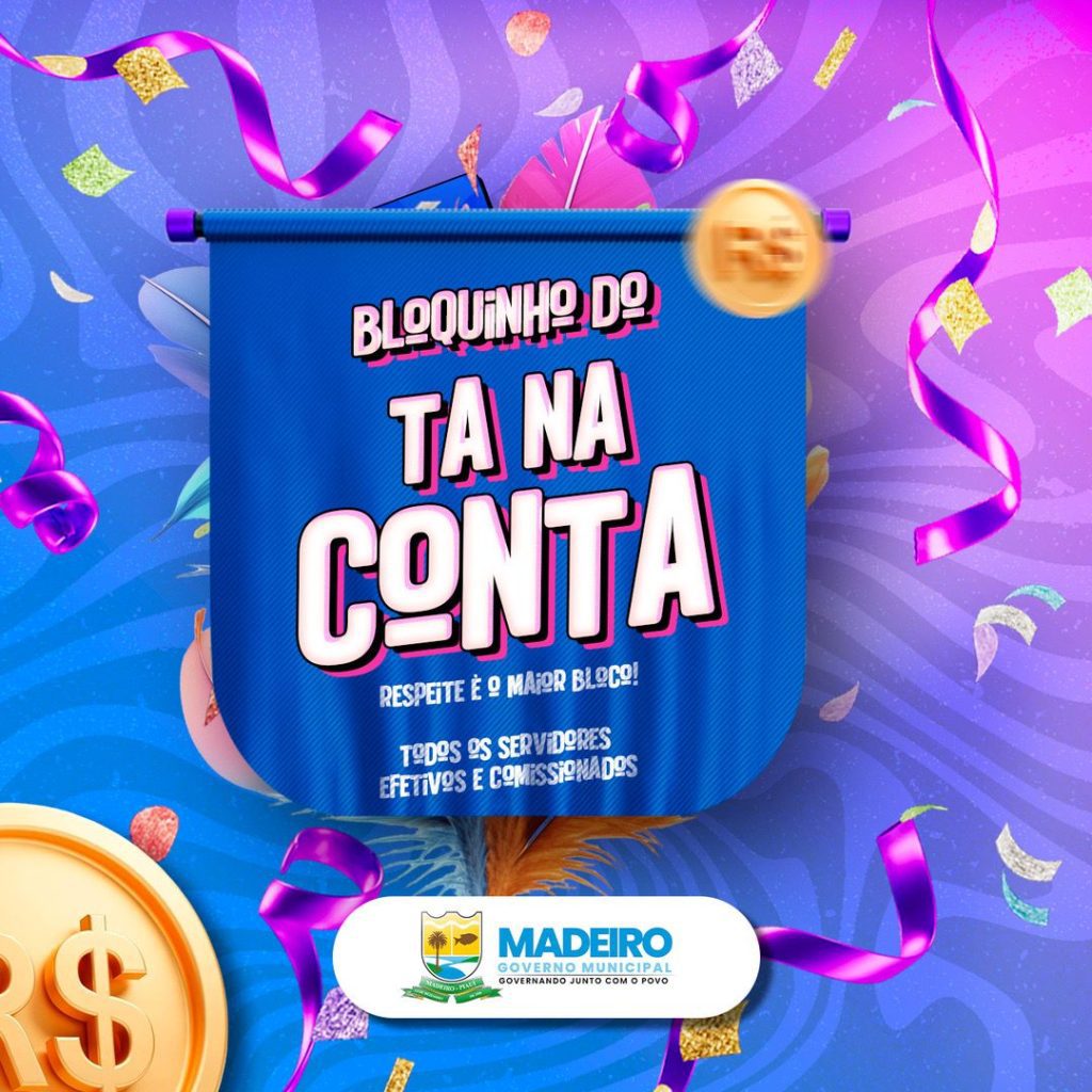 O maior bloco já saiu às ruas:#TáNaConta! A Prefeitura de Madeiro valoriza quem faz a cidade acontecer! Todos os servidores efetivos e comissionados já podem conferir o pagamento na conta. Aproveitem o Carnaval com tranquilidade e responsabilidade!