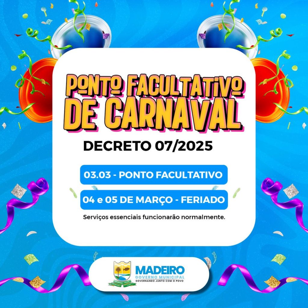 Atenção, servidores e população de Madeiro!De acordo com o Decreto 07/2025, ficou estabelecido:03/03 – Ponto Facultativo04 e 05/03 – Feriado de CarnavalA Lembrando que os serviços essenciais funcionarão normalmente!Aproveitem o Carnaval com alegria e responsabilidade!